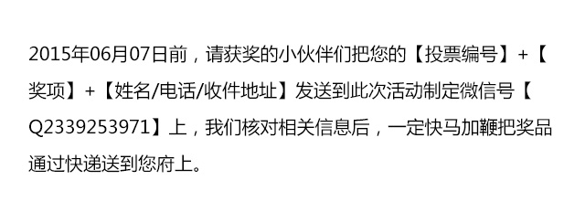 【兌獎規(guī)則】:(1)本投票活動結(jié)束時間:2015年05月25日;