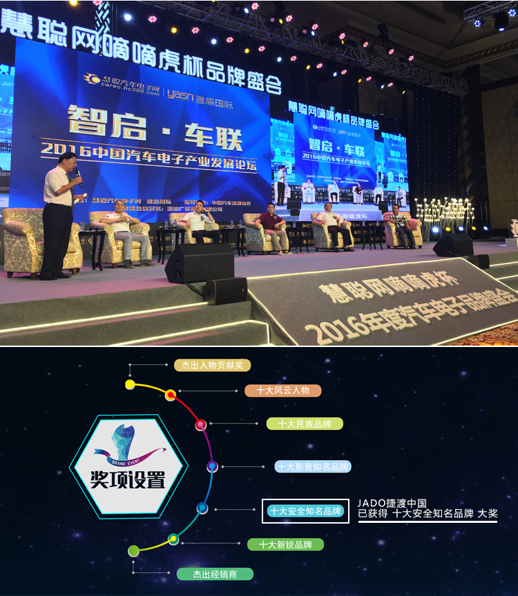 2016年7月21日,由慧聰網(wǎng)主辦的“2016年度汽車電子行業(yè)品牌盛會”在廣東廣州隆重舉行。JADO捷渡中國受邀參加盛典。