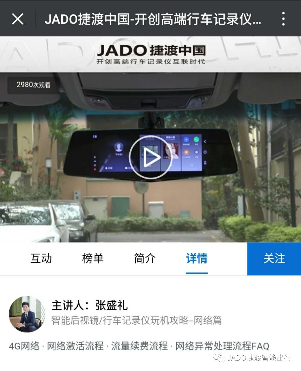 直播中,張盛禮先生就網(wǎng)絡(luò)注冊激活流程進(jìn)行現(xiàn)場演示,使觀眾仿佛置身現(xiàn)場,對于JADO智能行車記錄儀的使用一目了然,更加得心應(yīng)手。同時(shí)也針對使用中可能出現(xiàn)的微信公眾號(hào)二維碼加載失敗或者網(wǎng)絡(luò)異常的問題,進(jìn)行措施處理的講解。