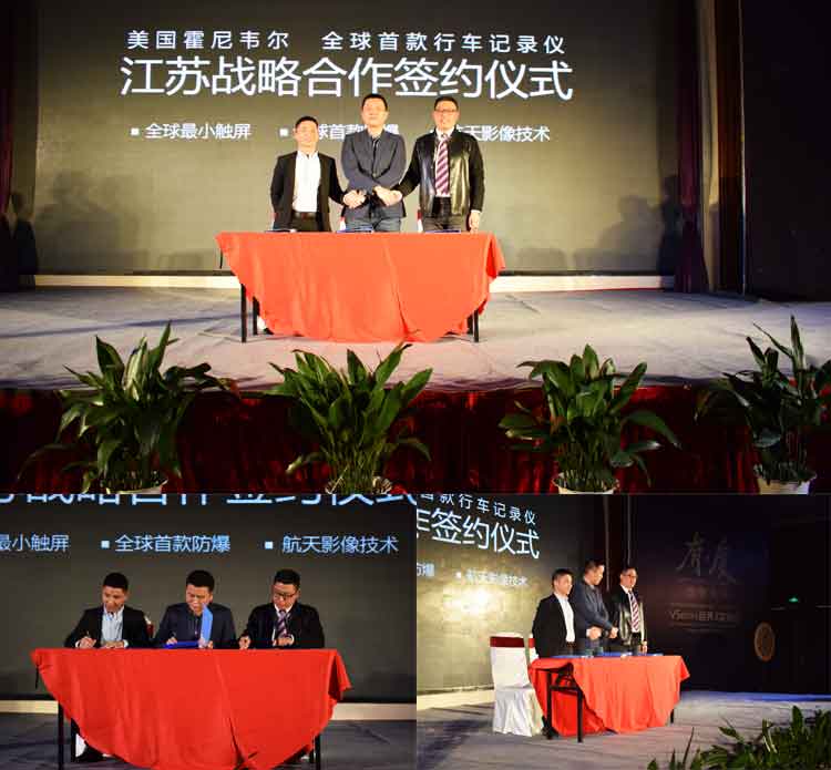 JADO捷渡智能(中國(guó))營(yíng)銷中心總經(jīng)理陳問文先生與揚(yáng)州天泓汽車貿(mào)易有限公司總經(jīng)理施德春先生、蘇州天通汽車服務(wù)有限公司總經(jīng)理周林海先生進(jìn)行了霍尼韋爾行車記錄儀在江蘇地區(qū)的簽約授權(quán)儀式,這標(biāo)志著霍尼韋爾行車記錄儀開啟了江蘇區(qū)域市場(chǎng)。
