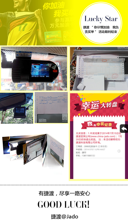 活動(dòng)開始,參與人數(shù)較多,每天都會(huì)有新的獎(jiǎng)項(xiàng)產(chǎn)生,但前三等大獎(jiǎng)卻沒人中,直到6月28日一等獎(jiǎng),才被安徽的一位幸運(yùn)觀眾摘取,價(jià)值12500元的70寸大電視,這位觀眾激動(dòng)地說,這么好的獎(jiǎng)品,準(zhǔn)備留給兒子結(jié)婚用!也許是好運(yùn)連連,7月1日有兩位幸運(yùn)觀眾摘取了三等獎(jiǎng),價(jià)值2000元中石化加油卡。事情常出乎人意料,7月1日以后小獎(jiǎng)是不斷有人中,前三等大獎(jiǎng)卻是一直再?zèng)]有出來,直到活動(dòng)結(jié)束前兩天,即7月12日,浙江余姚的一名姓楊的幸運(yùn)者摘取了二等大獎(jiǎng),價(jià)值10000元加油卡,這位幸運(yùn)者特別開心地給我們打電話來說,我一年的油費(fèi)全省了啊!真的是"我盡情加油,捷渡負(fù)責(zé)買單",哈哈......