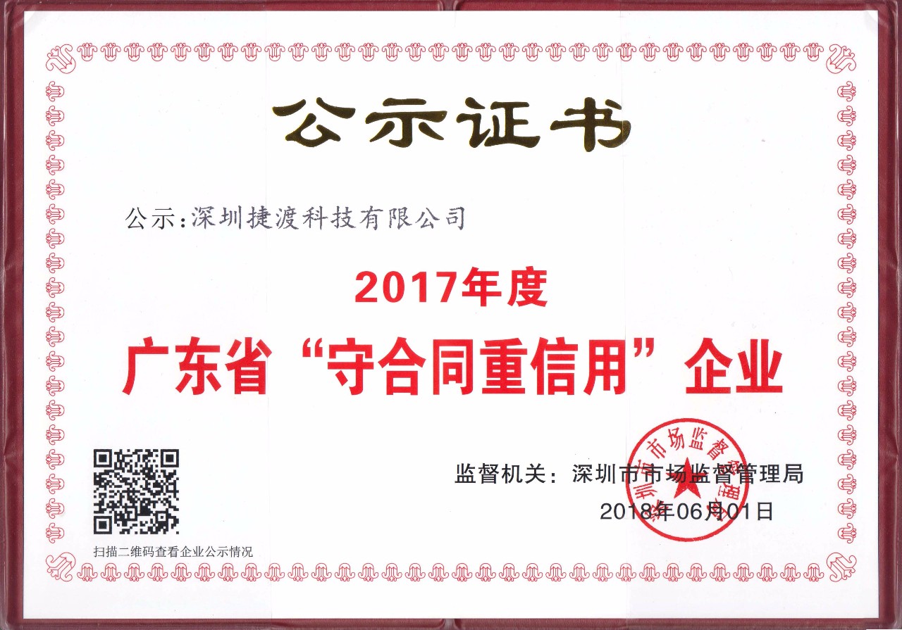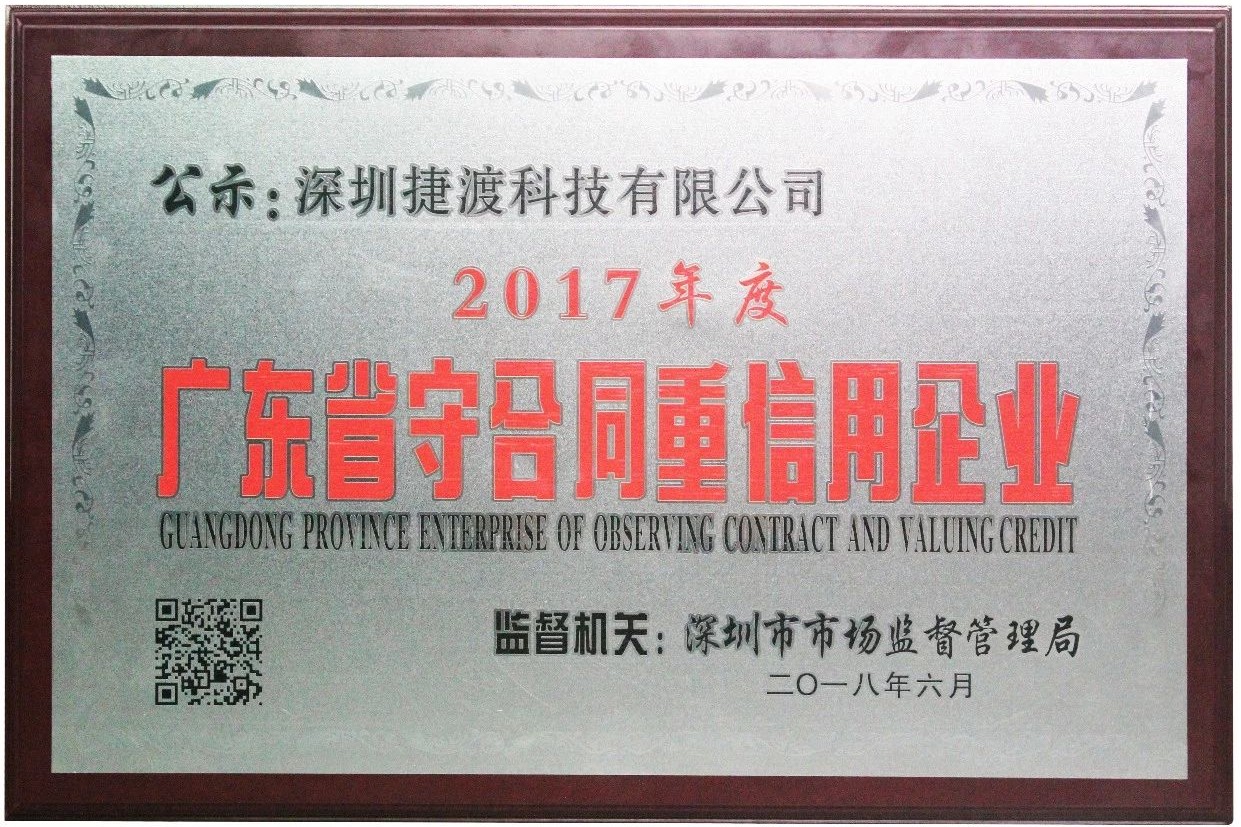 6月13日上午,2017年度廣東省“守合同重信用企業(yè)”的授牌儀式在深舉行。JADO捷渡智能(中國(guó))獲頒 “守合同重信用企業(yè)”榮譽(yù)證書,這是社會(huì)各界和廣大企業(yè)對(duì)公司一貫嚴(yán)守合同信用、堅(jiān)守商業(yè)誠(chéng)信的高度評(píng)價(jià)和充分認(rèn)可。