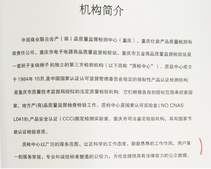中國(guó)商業(yè)聯(lián)合會(huì)產(chǎn)(商)品質(zhì)量監(jiān)督檢測(cè)中心(重慶)、重慶仕益產(chǎn)品質(zhì)量檢測(cè)有限責(zé)任公司、重慶市電子電器商品質(zhì)量監(jiān)督檢驗(yàn)站、重慶市五金商品質(zhì)量監(jiān)督檢驗(yàn)站是一套班子多塊牌子的獨(dú)立的第三方檢測(cè)機(jī)構(gòu)(以下簡(jiǎn)稱“質(zhì)檢中心”)。質(zhì)檢中心成立于1984年10月,是中國(guó)國(guó)家認(rèn)證認(rèn)可監(jiān)督管理委員會(huì)指定的強(qiáng)制性產(chǎn)品認(rèn)證檢測(cè)機(jī)構(gòu),是重慶市質(zhì)量技術(shù)監(jiān)督局授權(quán)的法定質(zhì)量檢驗(yàn)機(jī)構(gòu),他們根據(jù)各自的授權(quán)范圍承擔(dān)著國(guó)家、地方產(chǎn)(商)品質(zhì)量監(jiān)督抽查檢驗(yàn)工作。質(zhì)檢中心是國(guó)家認(rèn)可實(shí)驗(yàn)室(NO.CNASL 0418)、產(chǎn)品安全認(rèn)證(CCC)指定檢測(cè)實(shí)驗(yàn)室。重慶市司法鑒定檢驗(yàn)機(jī)構(gòu),具有國(guó)家節(jié)能認(rèn)證檢驗(yàn)資質(zhì)。質(zhì)檢中心以專業(yè)和誠(chéng)信標(biāo)準(zhǔn)塑造的公信力,為社會(huì)提供具有法律效力的公正數(shù)據(jù)。